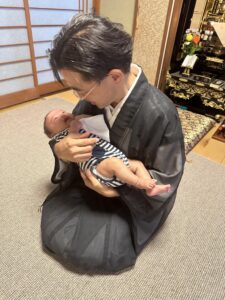 一方で、夕方に伺ったOさんのお宅では、喜びあふれるお参りとなりました。なんと、生まれて2ヶ月の赤ちゃんを抱いて、お孫さん夫婦も参ってくれました。このお孫さんは、かつて源光寺の子ども会やサマースクールにも通ってくれていました。あれから20年近くが経ちました。子ども会での無邪気な笑顔、進学・就職の報告、結婚という人生の節目、そして今、ご自身の子どもの誕生。思えば、Oさんのお宅との初めてのご縁は、Oさんのご主人(=お孫さんのおじいちゃま)のお葬儀でした。お葬式をお勤めしたご縁がその後も途切れず、毎年のようにご命日のお参りを重ねさせていただけたことで、ご家族の歩みに度々立ち会うことが出来ました。だからこそ、私にとっても、この日の喜びはひとしおなのです。